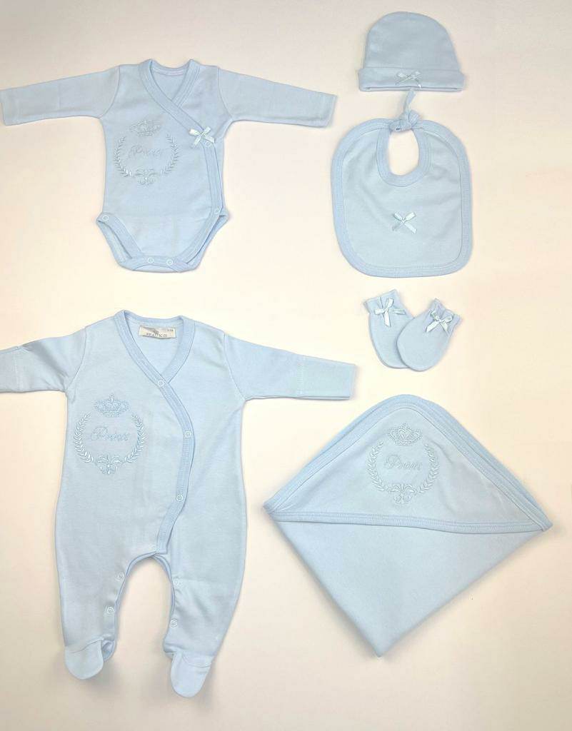 Hooded blanket, baby-grow, bodysuit, mittens, hat and bib.