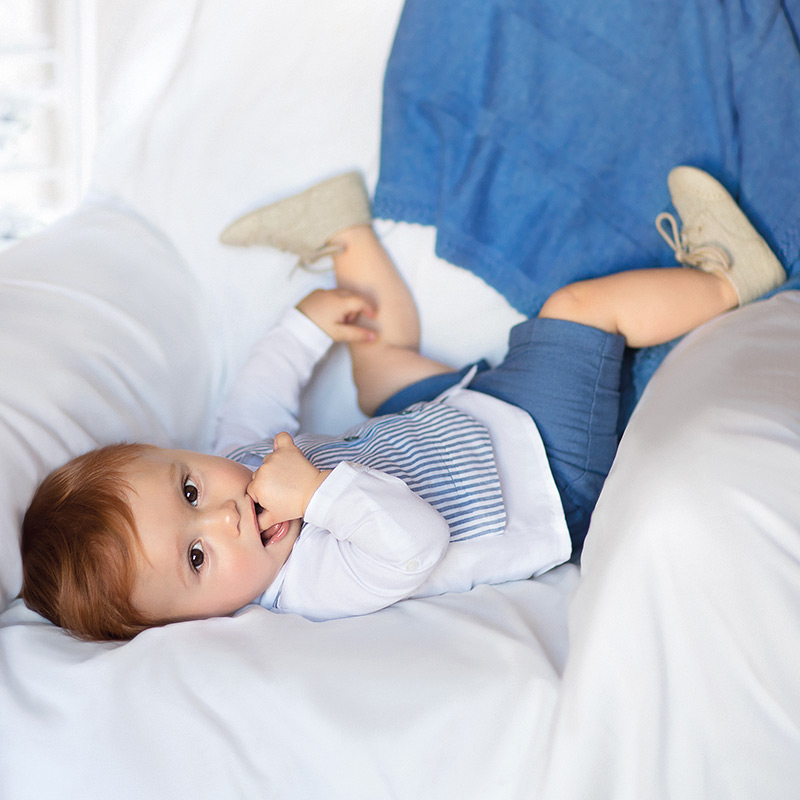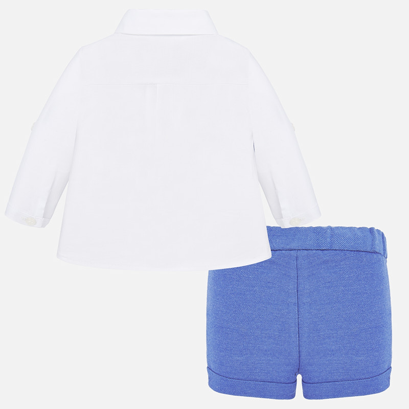 Short sleeved shirt with belt loop and a button on the side to roll the sleeve up and adjust the length. Shirt collar. Overlapping, non-detachable waistcoat. Button fastenings on the front. Made from fresh and contemporary fabric with linen. Mock, decorative front pockets. Striped pattern.