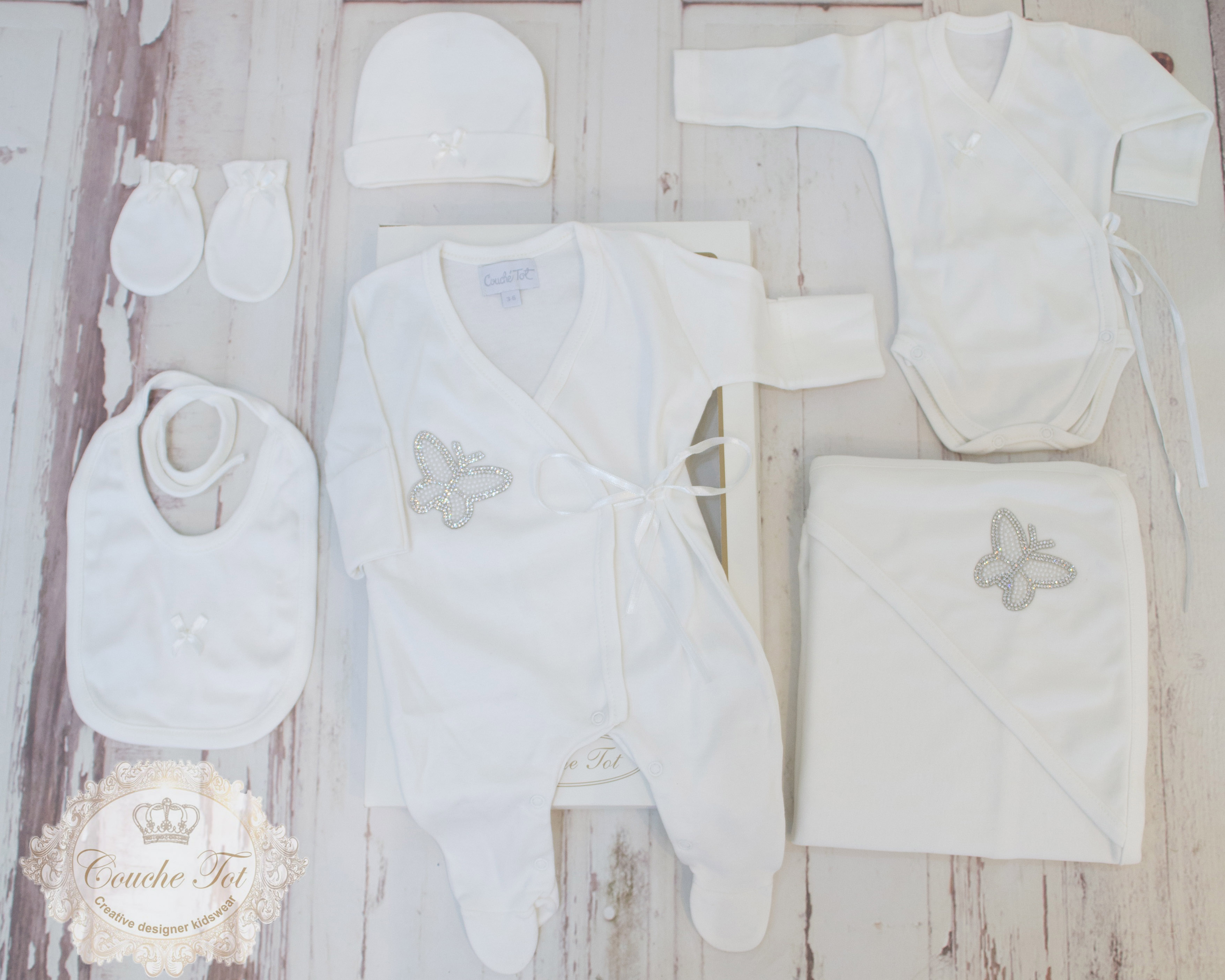 Includes: Babygrow, shortie, blanket, pair of mittens, hat and a bib.