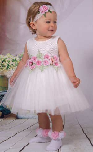 Girls special occasion Ivory dress with pink flowers and headband set from Beau KiD