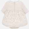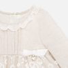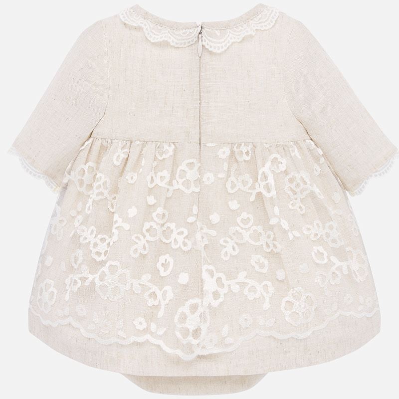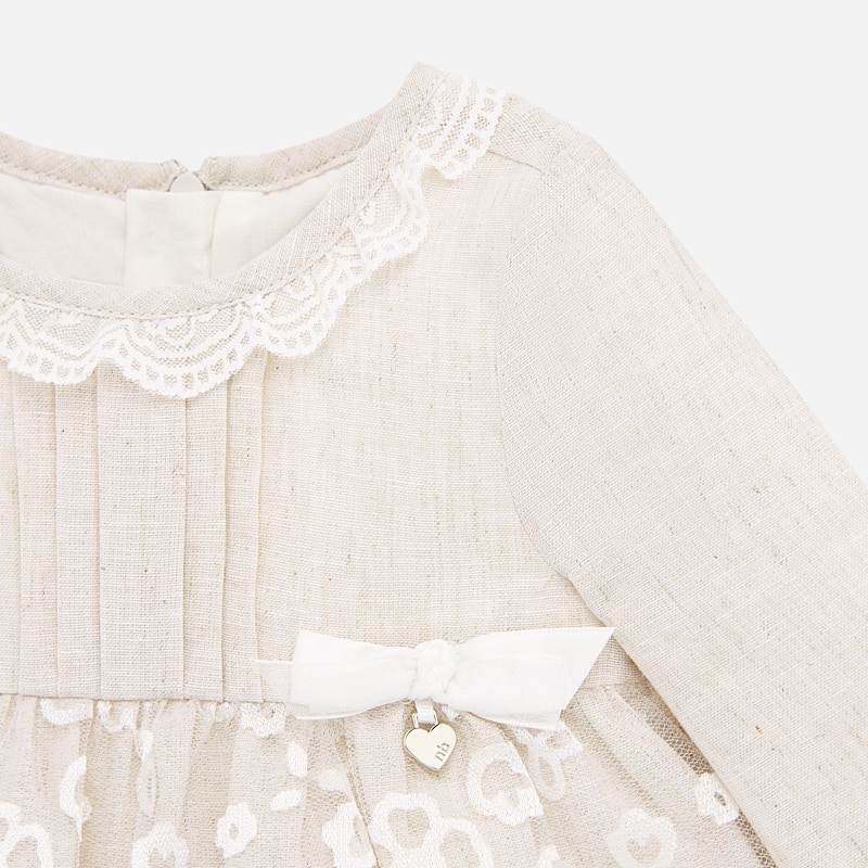 Short sleeved dress. Round neckline with ruffles. Zip fastening. Gathered design. Decorative elements: contrasting texture details, bow applique.