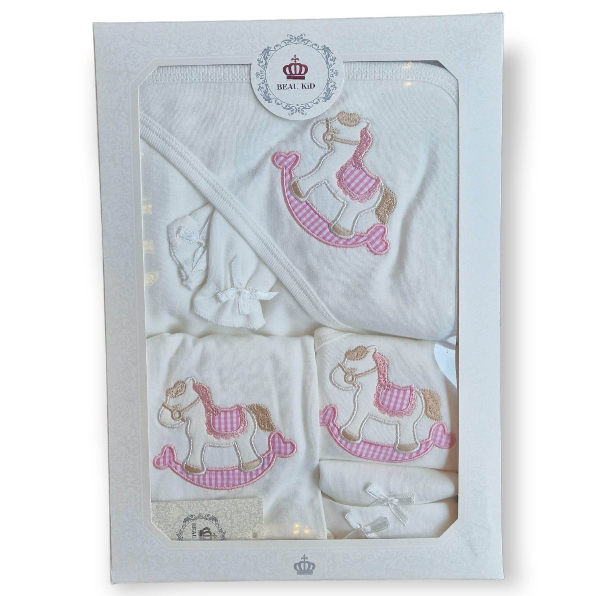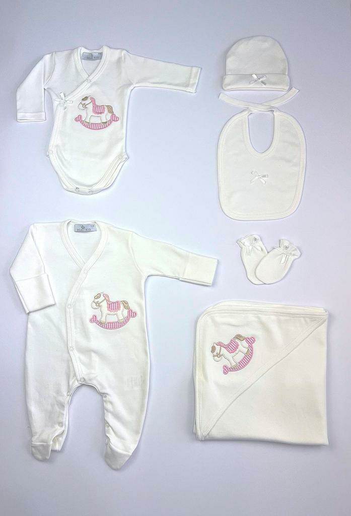 6 piece set includes: babygrow, bodyvest, hat, bib, hooded jersey blanket, and a pair of soft scratch mitts.
