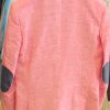 The jacket is fully lined in purple spots and it has contrasting elbow patches.