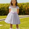 The bodice has reversible sequins and a ruched satin back with a matching sequinned bow on the back. This beautiful dress has tulle shoulder straps and a waistband decorated with organza flowers. The tulle skirt is lined in satin and voile with a tulle trim for extra volume.