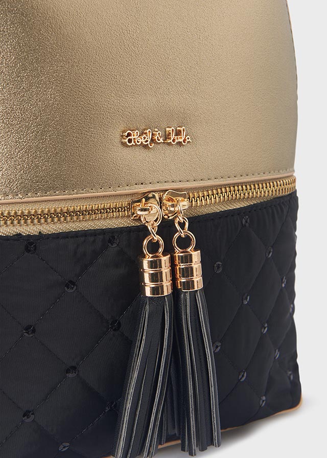 Synthetic Eco leather backpack with front tassels, decorative front panel, top zip, side zip and adjustable shoulder straps.