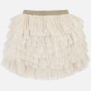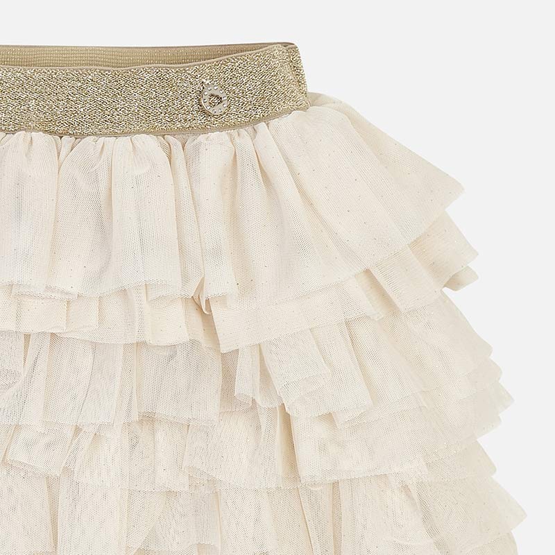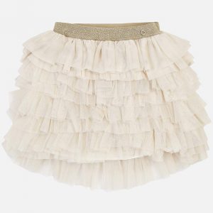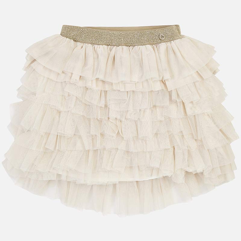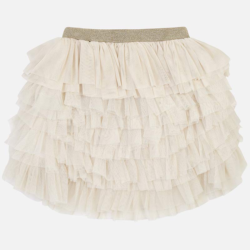 Short skirt for girl. Elastic waistband for a better fit. Made with lightweight, sheer tulle fabric. Gathered and ruffled design.
