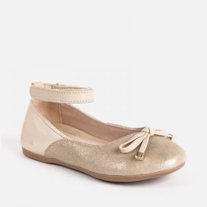 Shoes with cotton inner lining and leather insole. Leather outer material. Non-slip rubber sole to strengthen the grip when walking. Adjustable velcro strap on the ankle for a better fastening of the shoe. Decorative elements: metallic details.