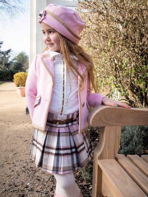 Elegant Pink and beige tartan skirt which has an elasticated waistband.