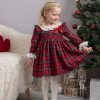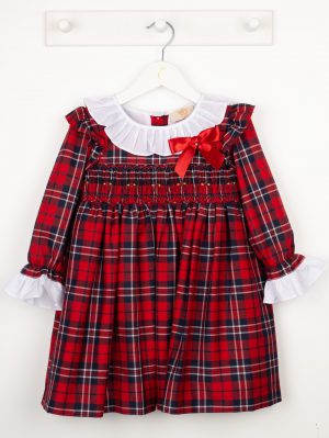 Pretty red and navy blue tartan smocked dress with frilled white trims for girls by Caramelo Kids
